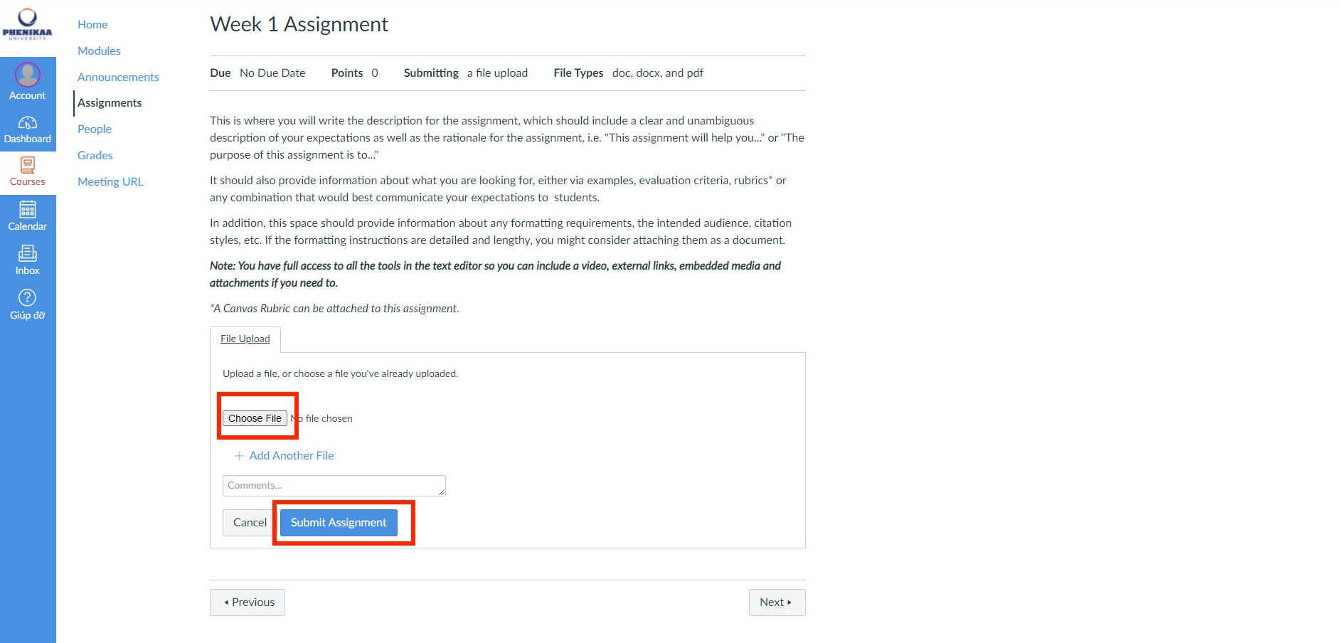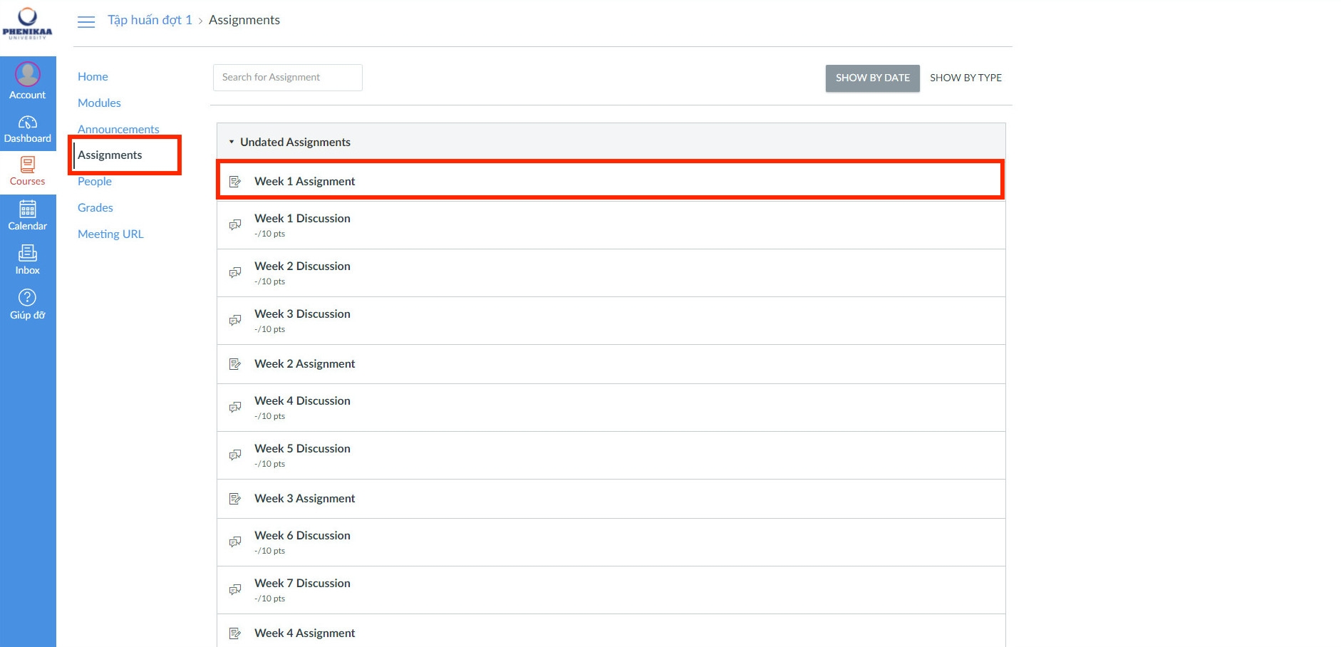 Bước 2: Chọn Assignments, chọn tuần cần nộp bài tập